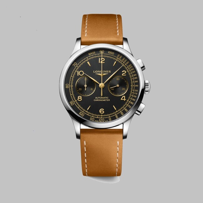 レコードの2022年の新作は、ロンジンの歴史的キャリバー13ZNクロノグラフにインスパイアされたプッシュピースを備えるクラシカルな外観を採用。レコードでは初となるタキメーターを採用した、クラシカルなスポーツテイストが光るデザイン。文字盤はゴールドの数字が転写されたマットブラックカラーにリーフ型の針をセットし、上品で落ち着いた印象を与えます。スポーティーかつクラシカルなデザインを合わせもつこの時計は、時計愛好家はもちろん、自分のスタイルを確立した大人にもぴったりの上級者向けアイテムです。ブラウンのレザーストラップまたはステンレススティールのブレスレットのラインアップです。