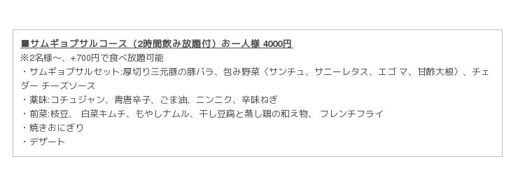 食べ応え十分な厚切り三元豚をとろ~りとろけるチーズで食べる本格サムギョプサルコースや、牛・豚・鶏3種のお肉が楽しめるコリアンカルビBBQコースをラインアップ。いずれも、枝豆や白菜キムチの他に、フレンチフライや焼きおにぎりなども含まれており、充実したコース内容でご用意しております。追加料金700円で食べ放題にも出来ます。飲み放題メニューは、「おろしレモンサワー」などオリジナルサワーや、女性に嬉しい低アルコールサワーなどの他に、生ビールやマッコリなど定番アルコールメニューも取り揃えています。ソフトドリンクも充実したラインアップで、お子様連れでも安心してご利用いただけます。