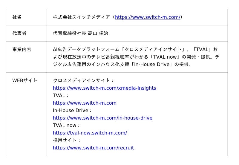 スイッチメディアについて株式会社スイッチメディアは、テレビCM+デジタル広告の出稿データを統一指標で一元管理し、過去比較やブランド横断分析を通じてメディア予算アロケーションを支援するAI広告データプラットフォーム「クロスメディアインサイト」の開発・運営、およびデジタル広告運用のインハウス化を支援する「In-House Drive」の提供、また国内最大規模のテレビ視聴パネルから取得したテレビCM接触データとインテージ社の購買データ(SCI(R))をシングルソースで連携させ、テレビCMの売上効果を分析する「TVAL」の開発・運営を行っています。
