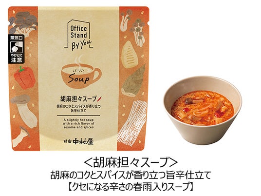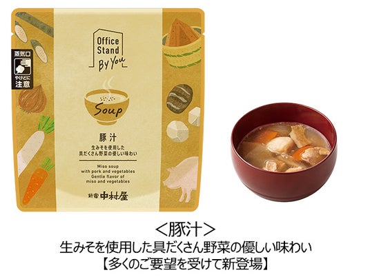 株式会社中村屋(本社:東京都新宿区、代表取締役社長 島田裕之、東証スタンダード:2204、以下 中村屋)は、スープを提供する法人向けオフィス常設型の社食サービス「Office Stand By You(オフィススタンドバイユー)」から「豚汁」・「胡麻担々スープ」の2品を新たに提供開始します。