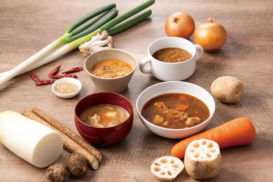このたび、和風の「豚汁」と中華風の「胡麻担々スープ」が加わりました。ラインアップが8種類に増えたことで、健康が気になるときやリフレッシュしたいときなど、気分やメインの食事によって選ぶ楽しさがより広がりました。電子レンジで90秒温めるだけで、具だくさんのスープが手軽に食べられます。