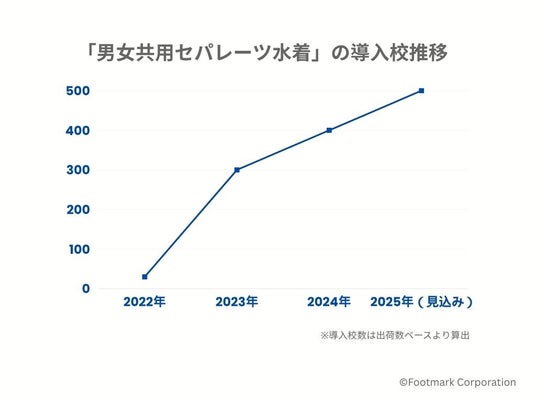 初年度はテスト販売で公立中学校3校が、従来の水着と選択できる形で導入。その後2023年度は300校以上、2024年には400校以上の学校が導入しました。今年度はさらに増え、500校以上の学校で採用を見込んでいます。(2025年6月時点)