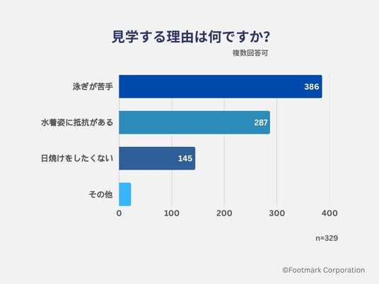 水泳授業における困りごととして「見学者の多さ」を挙げた学校は全体の30%(394件/1314件)。見学理由としては、「泳ぎが苦手(386件)」が最も多く、次いで「水着姿に抵抗がある(287件)」、「日焼けをしたくない(145件)」などが続きました。