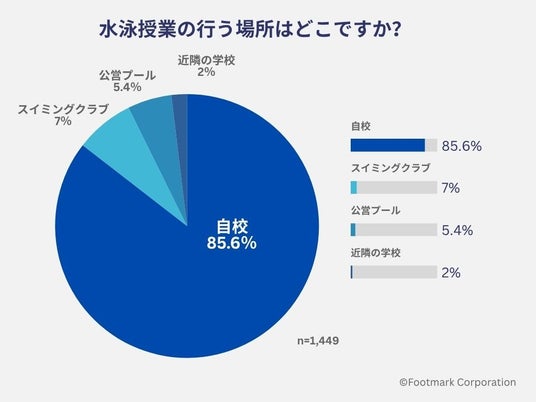 フットマーク株式会社(本社:東京都墨田区、代表取締役社長:三瓶 芳)は、全国(※1)1,445校の小・中・高校に「水泳授業に関するアンケート※2」を実施しました。「今年度、水泳授業を実施予定(n=1,322)」と回答した学校は 93.6%にのぼり、水泳授業が引き続き多くの学校で行われる見通しであることが明らかになりました。一方で、約3割の学校が授業時期を昨年より早めていたり、15%の学校がスイミングクラブや公営プールなど自校以外の施設を利用する予定であるなど、水泳授業の「時期」や「場所」に対する考え方にも多様化の兆しが見られました。
