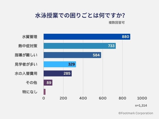 授業の運営に関する課題としては複数ある学校が大半で、「水質管理」「熱中症」「指導の難しさ」「見学者の多さ」などが挙げられました。さらに「その他」に見られた人手不足や指導者確保、見学者対応、施設面の問題などは、今後の学校水泳授業運営を考える上で重要な視点となりそうです。