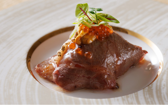 炙り国産牛で包んだジンジャーライス~ウニとイクラのトッピング~