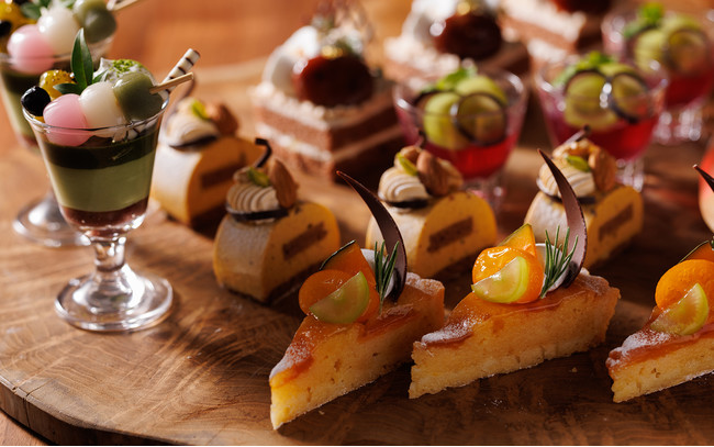 アプリコットのタルトは、秋の味覚のコンポートをトッピング。栗のモンブランは、チョコのスポンジにマロンクリームを乗せました。他にも、葡萄のゼリー、かぼちゃのプリン、抹茶のムースと、盛りだくさんの秋色スイーツビュッフェです。