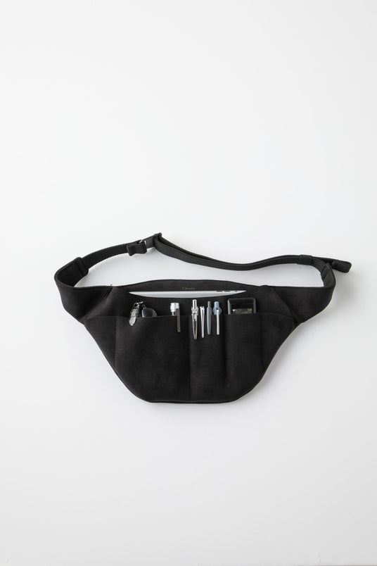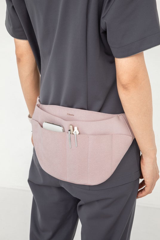 今回、登場する商品の生地には、車の内装や家具などにも使用される東レ株式会社が開発した「Ultrasuede(R)」を使用しており、丈夫でありながらソフトな手触りが特徴です。手洗いが可能でお手入れがしやすいのもポイント。例えばラップバッグは、動きの多い現場でもストレスフリーに身につけることができます。ポケット代わりとしてご使用いただけるだけなく、複数の間仕切りがあるため、小物の整理にも最適です。バッグの他にも、ポケットの中で散乱してしまいがちな、ペンや聴診器をまとめておくのにぴったりなペンケースも発売いたします。