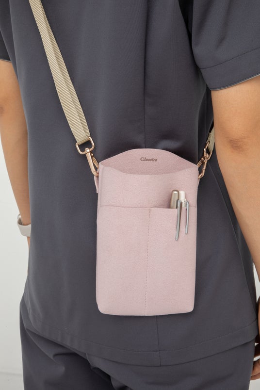 ショルダータイプになる取り外し可能なストラップ付きで、肩掛けや腰ポケットに入れられる2way仕様になっています。本体と内側に全5つのポケット付きです。白衣やスクラブの腰ポケットに入るサイズのペンケースで、聴診器や小物類をまとめるのにぴったりです。