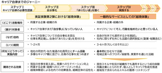 昨今は、社外での活躍の場としての「越境体験」(図2:一般的なサービスとしての越境体験)を、研修プログラムのひとつとして組み入れている企業も増えてきましたが、こうしたプログラムへの参加は「既にキャリア自律している人」が中心であり、その手前でキャリア自律の自分事化を推進したいという企業も多くあります。