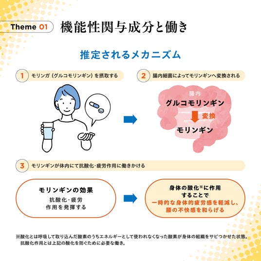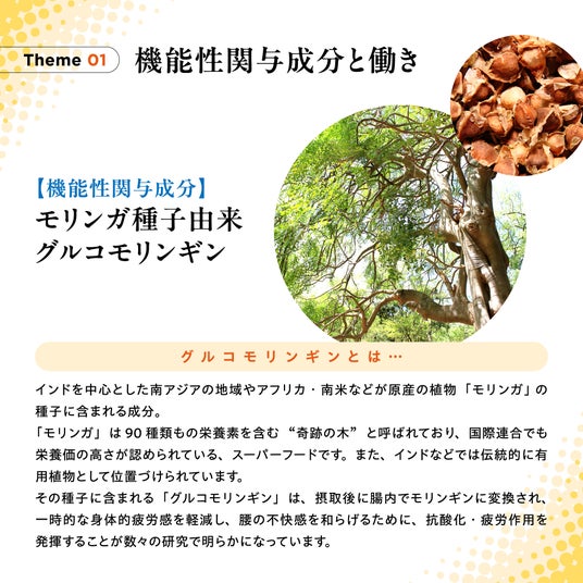 ・商品特長:日常生活で疲れを感じやすい方の一時的な身体的疲労感を軽減し、腰の負担を感じやすい方の腰の不快感を和らげる機能の、モリンガ種子由来グルコモリンギン含有