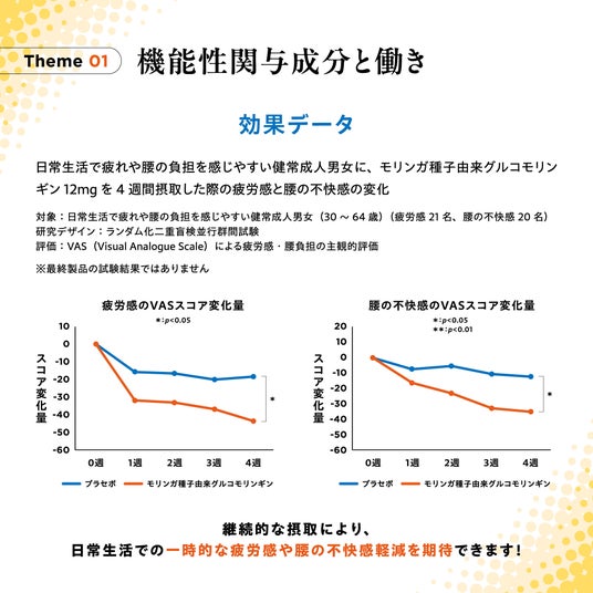 [対象:日常生活で疲れや腰の負担を感じやすい健常成人男女(30~64歳)(疲労感21名、腰の不快感20名)研究デザイン:ランダム化二重盲検並行群間試験 評価:VAS(Visual Analogue Scale)による疲労感・腰負担の主観的評価]