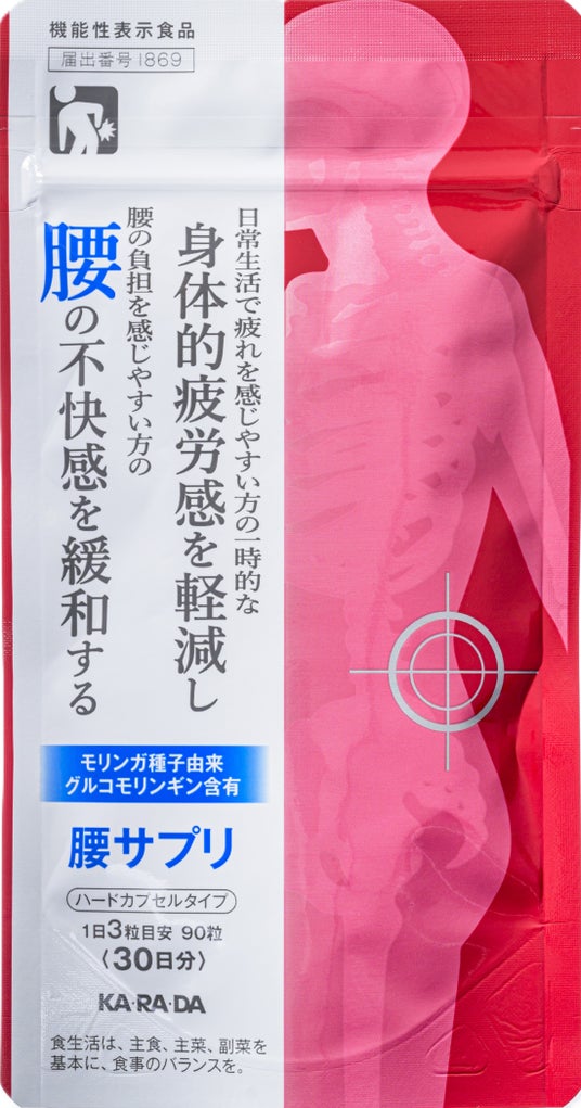 整体×骨盤サロン「カ・ラ・ダ ファクトリー」(以下 カラダファクトリー)などを海外・国内に350店舗以上展開する株式会社ファクトリージャパングループ(本社:東京都千代田区、代表取締役社長:高橋 健介、以下 ファクトリージャパン)は、“日常生活で疲れを感じやすい方の一時的な身体的疲労を軽減し” ”腰の負担を感じやすい方の腰の不快感を緩和する”という2つの機能を持つ機能性表示食品『KA・RA・DA 腰サプリ』(90粒/30日分・税込4,000円)を、9月5日(木)より、カラダファクトリー店舗及び公式通販サイト「カ・ラ・ダ マルシェ」にて販売を開始いたします。