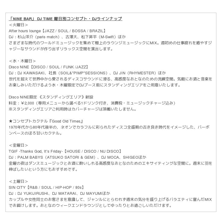 そこで、おとなが遊べるスポットとして更なる進化を目指すべく「NINE BAR」のDJ TIMEの内容を一新し、気分に合わせてお楽しみいただけるよう曜日ごとにテーマを設けたコンセプトのバーラウンジへと生まれ変わります。