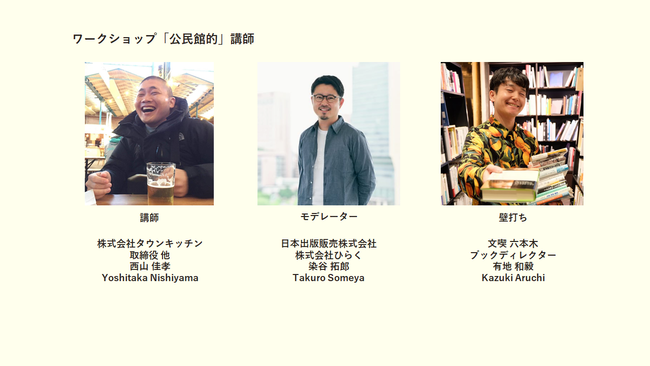 ワークショップ「公民館的」では、シェアオフィス・コインランドリー・カフェ・公園なども現代的な公民館であると捉え、魅力ある公民館のようなあり方を「公民館的」と定義し、そのあり方をヒントに、企業、学校、地域といったさまざまな場とコミュニティの課題にアプローチし、公共領域でのアクションを共創していきます。パートナーとして、「公民館のしあさって」プロジェクトの西山 佳孝氏を招き、「文喫 六本木」がプラットフォームとなって、参加者のチームメイキング、企画立案、場とのマッチングを行うことで、関わる人のメリットをつないでいきます。