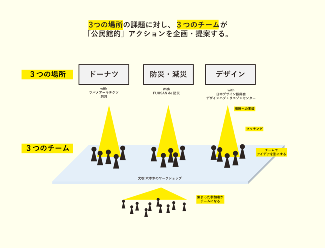 ワークショップは全6回を予定。3つの企業・プロジェクトの「場所」と連携し「3つの場所の課題」に対して、参加者がチームごとに取り組んでアイデアを出していきます。ワークショップ終了後は、「文喫 六本木」で「それぞれの「公民館的」展(仮)」を開催します。