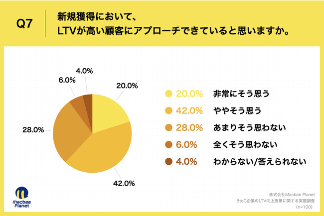 「Q7.新規獲得において、LTVが高い顧客にアプローチできていると思いますか。」(n=100)と質問したところ、「非常にそう思う」が20.0%、「ややそう思う」が42.0%という回答となりました。