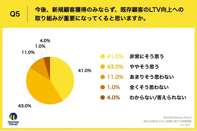 「Q5.今後、新規顧客獲得のみならず、既存顧客のLTV向上への取り組みが重要になってくると思いますか。」(n=100)と質問したところ、「非常にそう思う」が41.0%、「ややそう思う」が43.0%という回答となりました。