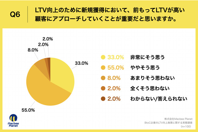 「Q6.LTV向上のために新規獲得において、前もってLTVが高い顧客にアプローチしていくことが重要だと思いますか。」(n=100)と質問したところ、「非常にそう思う」が33.0%、「ややそう思う」が55.0%という回答となりました。