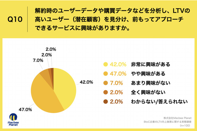「Q10.解約時のユーザーデータや購買データなどを分析し、LTVの高いユーザー(潜在顧客)を見分け、前もってアプローチできるサービスに興味がありますか。」(n=100)と質問したところ、「非常に興味がある」が42.0%、「やや興味がある」が47.0%という回答となりました。