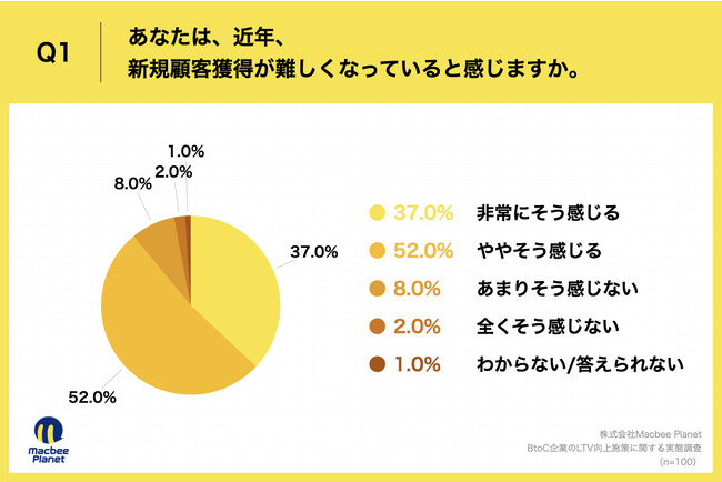 「Q1.あなたは、近年、新規顧客獲得が難しくなっていると感じますか。」(n=100)と質問したところ、「非常にそう感じる」が37.0%、「ややそう感じる」が52.0%という回答となりました。