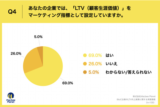 「Q4.あなたの企業では、「LTV(顧客生涯価値)」をマーケティング指標として設定していますか。」(n=100)と質問したところ、「はい」が69.0%、「いいえ」が26.0%という回答となりました。