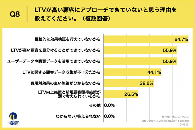 Q7で「あまりそう思わない」「全くそう思わない」と回答した方に、「Q8.LTVが高い顧客にアプローチできていないと思う理由を教えてください。(複数回答)」(n=34)と質問したところ、「継続的に効果検証を行えていないから」が64.7%、「LTVが高い顧客を見分けることができていないから」が55.9%、「ユーザーデータや購買データを活用できていないから」が55.9%という回答となりました。