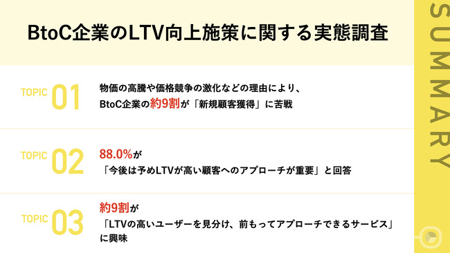 今回の調査では、物価高や価格競争により、BtoC企業のほとんどが新規顧客獲得に苦戦しているということが分かりました。また、そのような状況だからこそ、顧客とは一時的な接点で終わるのではなく、継続的な購買に繋がるよう、LTVが高い顧客の獲得を強く意識していることが明らかとなりました。LTVが高い顧客にアプローチするためのサービスには約9割が興味を示しており、自社のノウハウだけでなく、他社のサービスを活用することも検討の余地があると言えるのではないでしょうか。