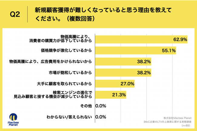 Q1で「非常にそう感じる」「ややそう感じる」と回答した方に、「Q2.新規顧客獲得が難しくなっていると思う理由を教えてください。(複数回答)」(n=89)と質問したところ、「物価高騰により、消費者の購買力が低下しているから」が62.9%、「価格競争が激化しているから」が55.1%、「物価高騰により、広告費用をかけられないから」が38.2%という回答となりました。