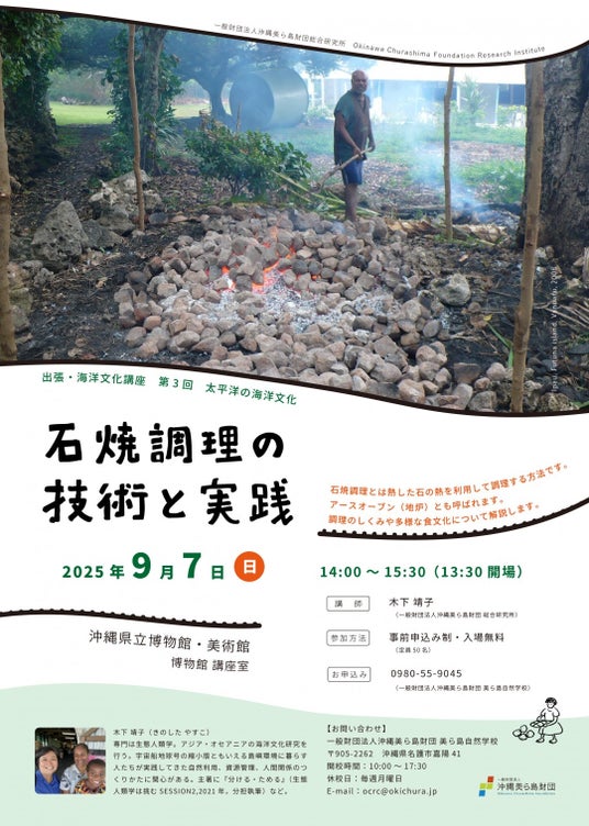 一般財団法人 沖縄美ら島財団(所在地:沖縄県本部町)は、2025年9月7日(日)に、出張・海洋文化講座「石焼調理の技術と実践」を沖縄県立博物館・美術館(沖縄県那覇市)にて開催いたします。本講座は、海洋博公園内にある海洋文化館が所蔵する資料をもとに、アジア・オセアニア地域の海洋文化を広く紹介する取組の一環として実施されるものです。今回のテーマは、「石焼調理」。