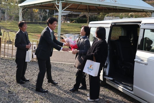 写真左より、平戸観光協会 藤澤美好(ふじさわみよし)会長、初回利用者 金 賢善(キム ヒョンソン)さん・寶美(ボミ)さん親子、平戸市黒田成彦市長