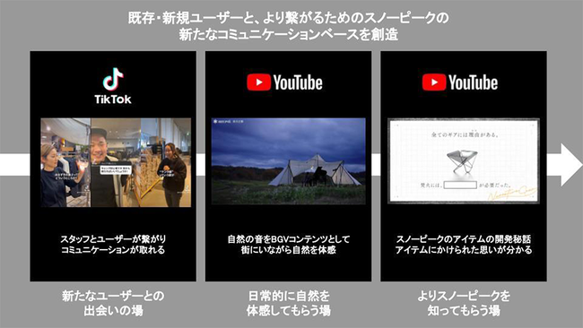 YouTubeチャンネル上で単発のコンテンツを発信するだけでなく、各ソーシャルプラットフォームの特性を活かした様々なコンテンツを展開することで、スノーピークの既存ファンだけでなく、事業やメッセージに共感する新規ファンまでを巻き込むコミュニケーションベースの創造を目指します。