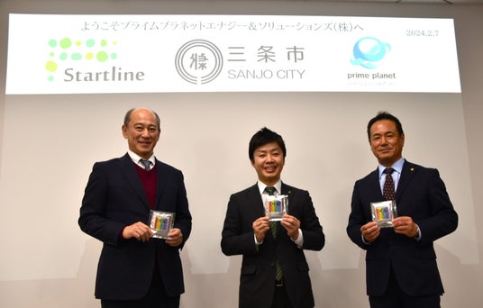 三条市 滝沢亮市長(中央)プライム プラネット エナジー&ソリューションズ株式会社 代表取締役社長好田 博昭(右) 株式会社スタートライン 代表取締役 西村賢治(左)