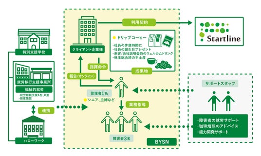 BYSNは、障害者が珈琲の焙煎業務を行う障害者雇用支援サービスです。BYSNを利用する企業に雇用された障害者は、BYSN専用のプロ仕様焙煎機で高品質な珈琲豆を作り上げます。利用企業はオリジナルブレンド珈琲の開発に取り組んだり、社員に珈琲を振舞ったり、珈琲豆をノベルティなどのプレゼントとして活用します。また、BYSNはカフェ同様の設備を有し、地域と連携したイベントの開催や模擬業務を通じてトレーニングを行うことが可能です。ブレンダーやバリスタなど専門性の高い業務へチャレンジする機会を設け、ステップアップも支援します。