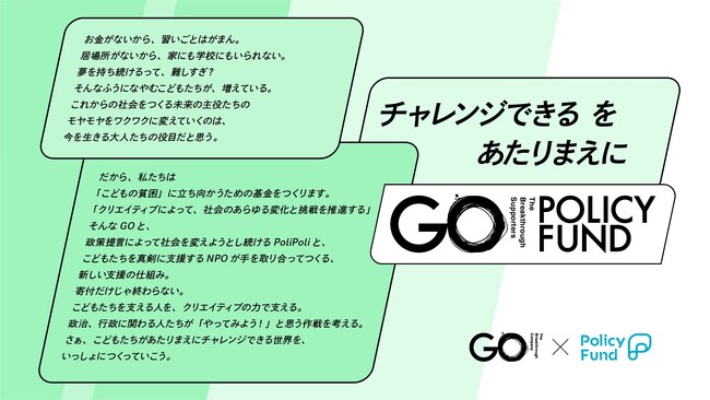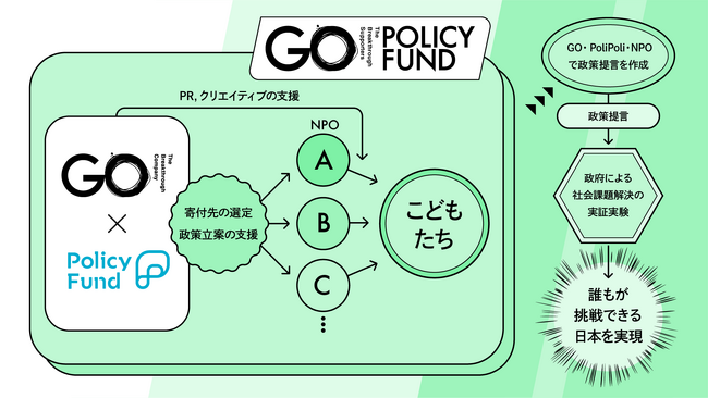 「GO POLICY FUND」は、PoliPoliと、企業のブランディングや事業成長支援を幅広く手掛けてきたGOのアセットを掛け合わせて、こどもの問題解決に取り組むNPO等の支援を行う新しい形の寄付基金です。