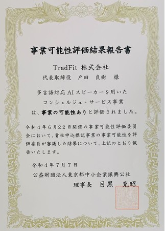 TradFit株式会社( 本社:東京都千代田区、代表取締役:戸田 良樹、以下「TradFit」)は、公益財団法人東京都中小企業振興公社の事業可能性評価事業において、TradFitが展開する多言語対応AIスピーカーを用いたコンシェルジュ・サービス事業が、「事業の可能性あり」との評価を頂きました。