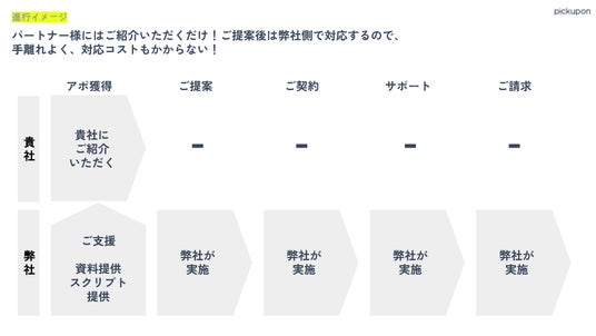 「pickupon紹介パートナープログラム」では、パートナー企業様はpickupon(ピクポン)にトスアップをしていただくだけで、成約時に、当社設定の手数料をお支払いいたします。