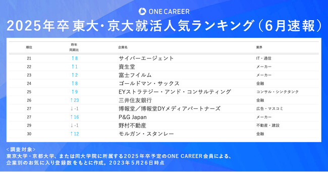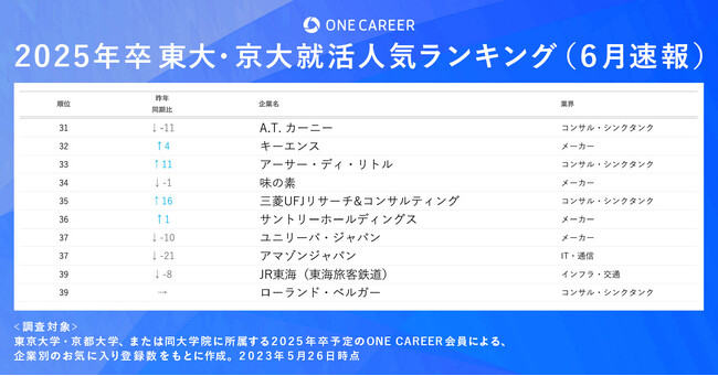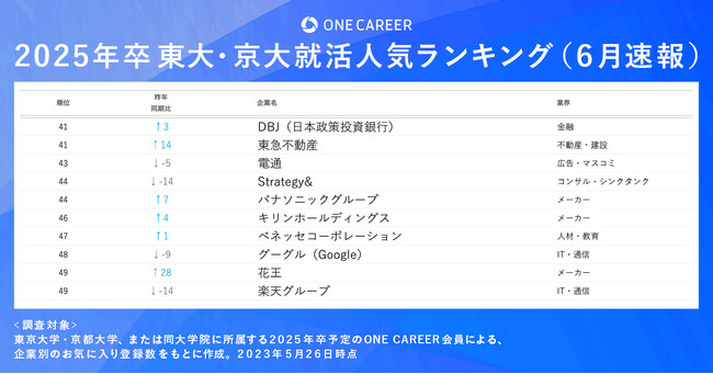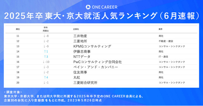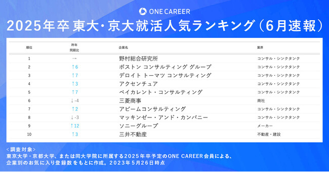 はじめてのキャリアを選ぶ、就活サイト「ONE CAREER」を運営する株式会社ワンキャリア(本社:東京都渋谷区、代表取締役社長 宮下尚之、以下ワンキャリア)は、「東大・京大25卒就活人気ランキング 6月速報」を発表いたしました。