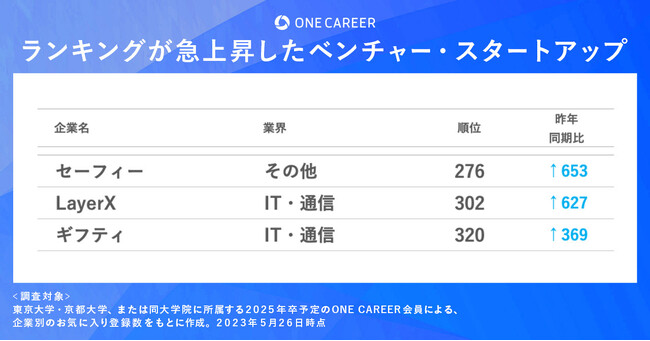 その中で上位に入ったスタートアップ企業では、BtoB事業を展開している企業が目立ちました。中でも大きく順位を伸ばしたセーフィーは、セキュリティ技術の革新性と信頼性が認められ、企業への導入実績を順調に伸ばしています。「ONE CAREER」に投稿されたクチコミでは「映像におけるプラットフォームを作りたいという大きな夢に非常に惹かれた」といった声があることからも、事業としての成長性を見て、これらの企業が選ばれていると言えるでしょう。