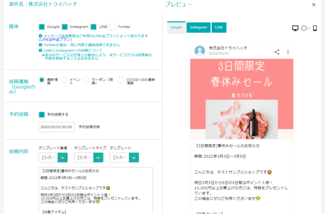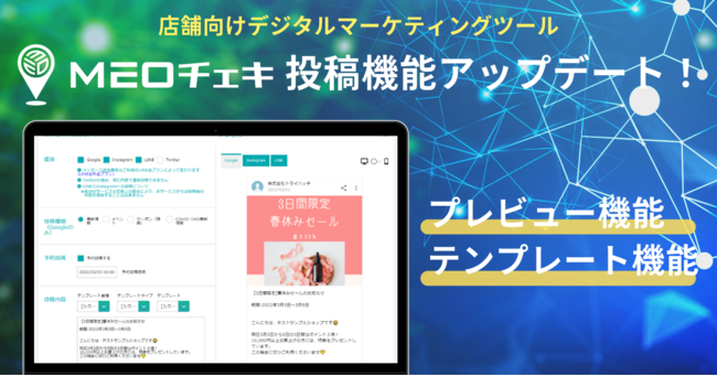 株式会社トライハッチ(東京都新宿区:代表取締役 武藤 尭行)は、同社が独自開発・提供するGoogleビジネスプロフィール管理・分析ツール「MEOチェキ」の投稿機能にプレビュー機能とテンプレート選択機能を追加アップデートいたしました。