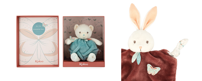 肩に留まった蝶々が愛らしいぬいぐるみ。赤ちゃんの小さな手でもつかみやすいように、生地の一部はプリーツ状に織られています。足に刺繍されたバブルのモチーフとKalooのイニシャル「K」がポイントです。