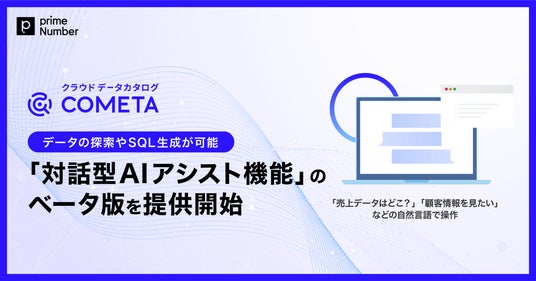 株式会社primeNumber(本社:東京都品川区、代表取締役CEO 田邊 雄樹)は、クラウド データカタログ「COMETA」のAIを活用した機能「COMETA AI」において、「対話型AIアシスト機能」ベータ版の提供を2025年5月1日に開始しました。