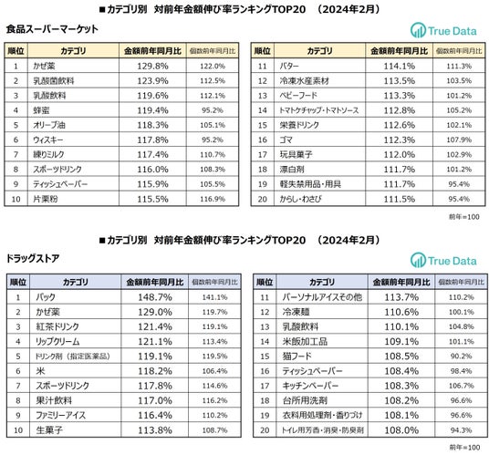 ~ドラッグストア、食品スーパーマーケット 2024年2月対前年伸び率TOP20カテゴリを発表~