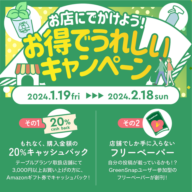 植物コミュニティアプリ「GreenSnap」を運営するGreenSnap株式会社(本社:東京都中央区、代表取締役:西田貴一)は、土を使わない観葉植物「Table Plants(テーブルプランツ)」を店舗で購入すると、全購入金額の20%をキャッシュバックする「お店にでかけよう!お得でうれしいキャンペーン」を2024年1月19日(金)より開始いたします。本キャンペーンに合わせて創刊されたフリーペーパーの配布も予定しています。