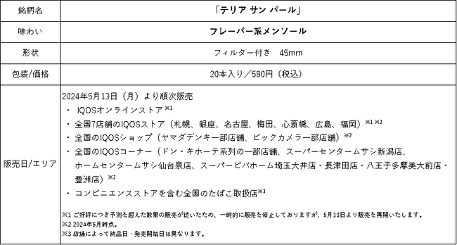 フィリップ モリス ジャパン合同会社(本社:東京都千代田区、社長:シェリー・ゴー、以下「PMJ」)は、2023年4月27日(木)より、IQOSオンラインストアと全国のIQOSストアで販売していた、加熱式たばこIQOS ILUMA i(イルマ アイ)およびIQOS ILUMA(イルマ)専用たばこスティック「TEREA(テリア)」のカプセル搭載製品「テリア サン パール」を、2024年5月13日(月)より、IQOSオンラインストア※、全国7店舗のIQOSストア※、IQOSショップ(ヤマダデンキ一部店舗、ビックカメラ一部店舗)、IQOSコーナー(ドン・キホーテ系列の一部店舗他)、コンビニエンスストアを含む全国のたばこ取扱店にて順次販売いたします。