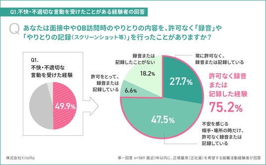 また、求職者の41.2%が面接・OB訪問時に「許可なく録音/記録」をした経験があると回答した一方、Q1で「明確なセクハラ」または「不快・不適切な言動(グレーゾーン)」を受けたと回答した層においては、その75.2%が「録音/記録を行った」と回答しました。