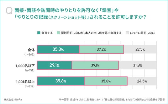 - 求職者による無断録音・記録の扱いは、「原則許可しないが申し出次第で許可」37.2%、「許可する」35.3%、「いっさい許可しない」27.5%と企業で分かれる