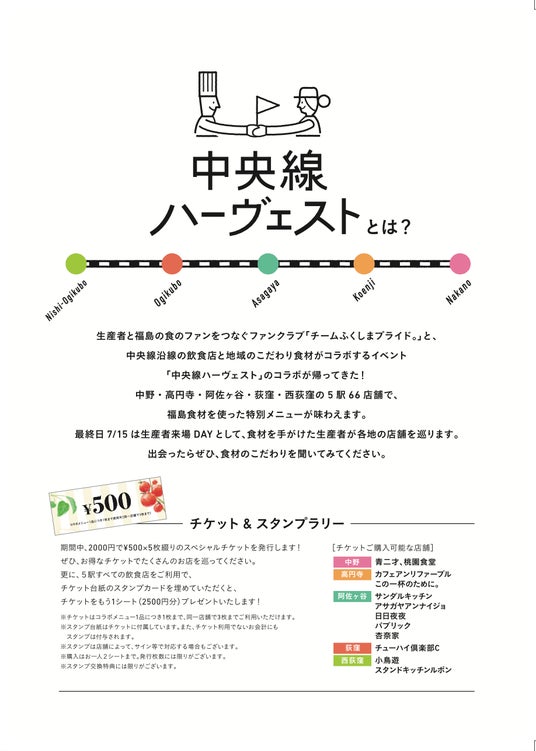 一般社団法人東の食の会(東京都品川区)が運営する、福島の食の生産者と消費者を繋ぐファンクラブ「チームふくしまプライド。」は、2024年7月6日(土)から7月15日(土)までの10日間、中野・高円寺・阿佐ヶ谷・荻窪・西荻窪の5駅周辺の67の飲食店が福島県産食材を使用したメニューを提供するイベント「中央線ハーヴェスト×チームふくしまプライド。2024」を開催します。7月15日(土)には生産者も来場し、各店舗で自身のプライドをもって育てた食材をPRします。同イベントの開催は今回で2回目となります。