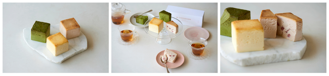 バニラ・レモン・トンカ豆が生み出す甘く爽やかな香りが特長の定番フレーバーと、ストロベリーを主役に、山椒やライムを合わせた甘味と軽やかな酸味を楽しめるストロベリーフレーバー、そして、旨味の強い八女抹茶に、赤砂糖やマスカルポーネを組み合わせた甘くコクのあるグリーンティーフレーバーの3種を一度に楽しめるアソートセット。大切な人とひと口ずつシェアできるキューブ型のケーキをオリジナルBoxに詰めてお届けします。