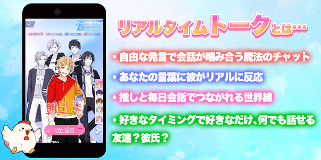 チャット系恋愛シミュレーションゲームの最先端!自由な発言で100%会話が噛み合う新感覚ゲーム&LIVE配信で彼と声でトークも出来る期待値No1恋愛シミュレーションゲームです。